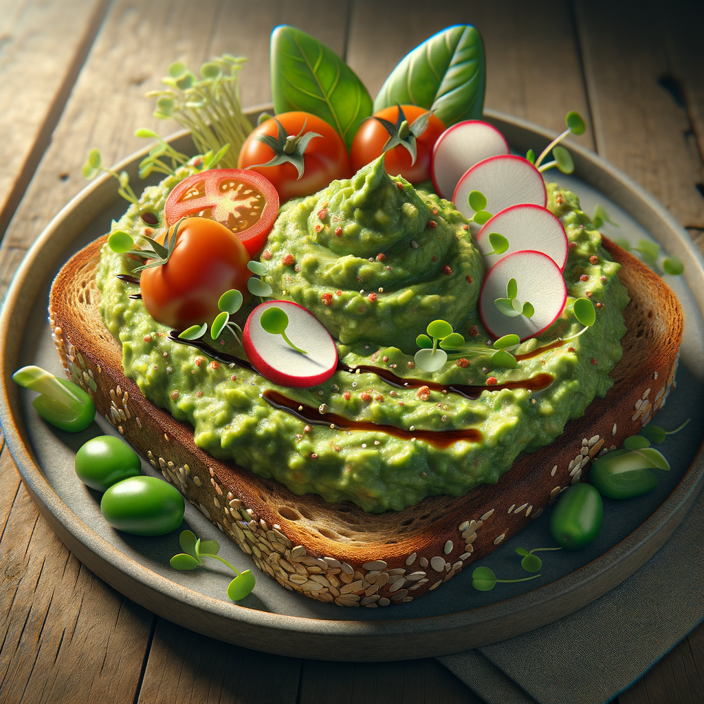 A hearty slice of multigrain toast topped with rich guacamole, heirloom tomatoes, radishes, and microgreens, drizzled with balsamic glaze.
