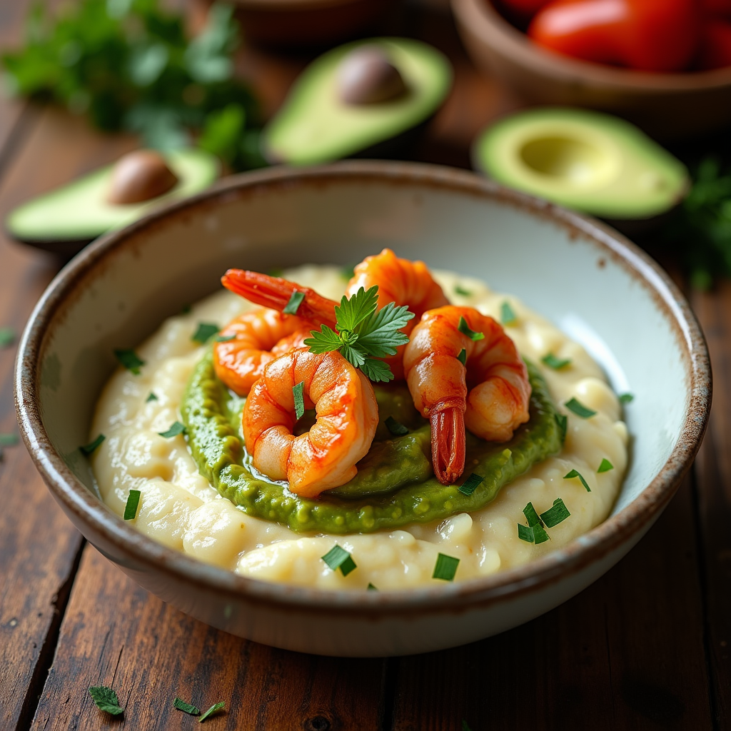 Guajillo Shrimp & Grits with Guacamole Crema