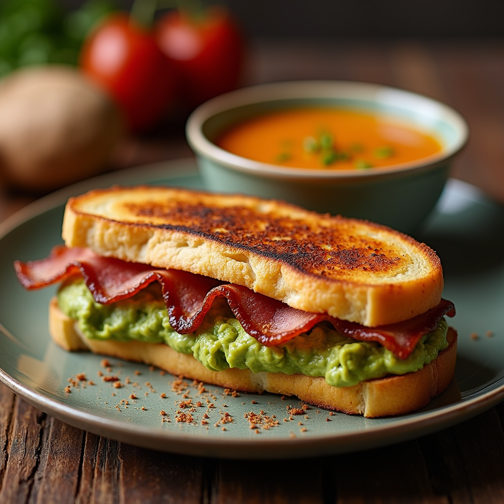 Grilled pimento cheese sandwich with crispy bacon and a thick layer of fresh guacamole. Served with a side of creamy tomato soup for dipping, a classic comfort elevated.