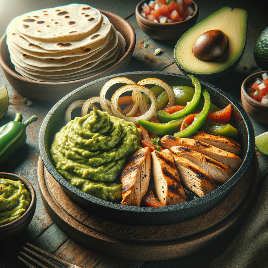 Tender slices of marinated chicken breast served on a hot skillet with sautéed onions and bell peppers, accompanied by warm tortillas and a side of rich avocado guacamole for spreading or dipping.