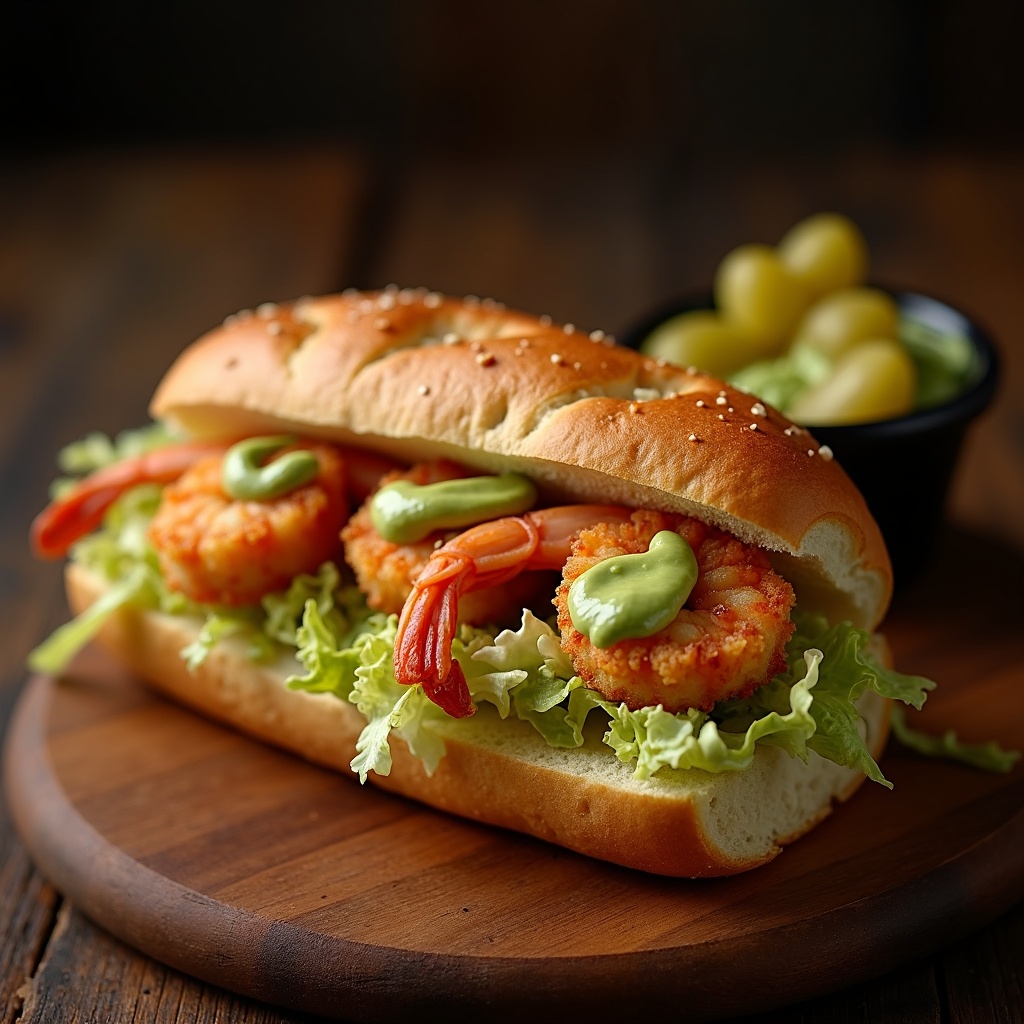 Crispy fried shrimp tossed in spicy Cajun seasoning, piled on a toasted baguette with creamy guacamole, shredded lettuce, and tangy remoulade. A Southern twist with vibrant green guacamole swirls.
