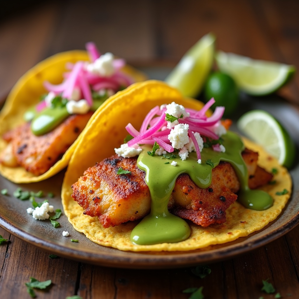 Flaky blackened catfish nestled in warm corn tortillas, topped with cool avocado dressing, pickled red onions, and crumbled queso fresco. A Cajun-inspired bite with creamy, zesty avocado drizzle.