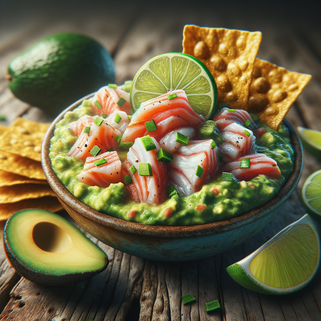 Fresh fish ceviche marinated in lime juice and mixed with creamy guacamole, served with crunchy tostadas for dipping.