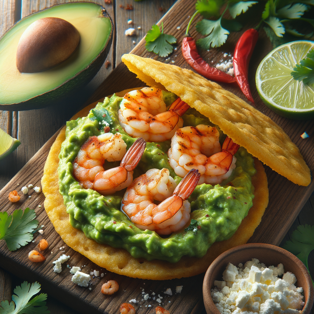 Crispy cornmeal arepas stuffed with zesty guacamole and succulent grilled shrimp, topped with a sprinkle of cotija cheese and fresh cilantro.