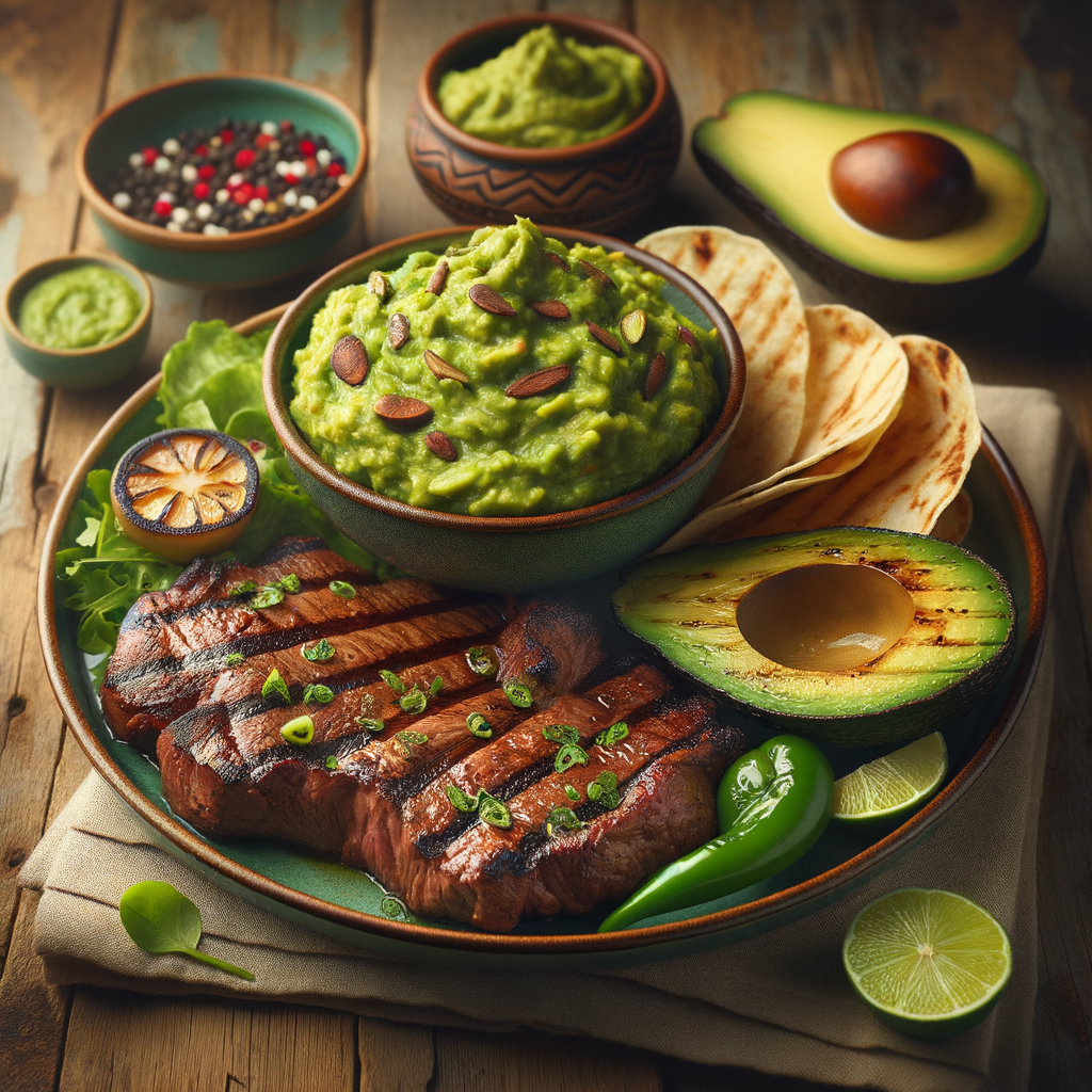 Grilled carne asada served with a side of rich and creamy guacamole, complemented by a warm tortilla and a lime wedge.