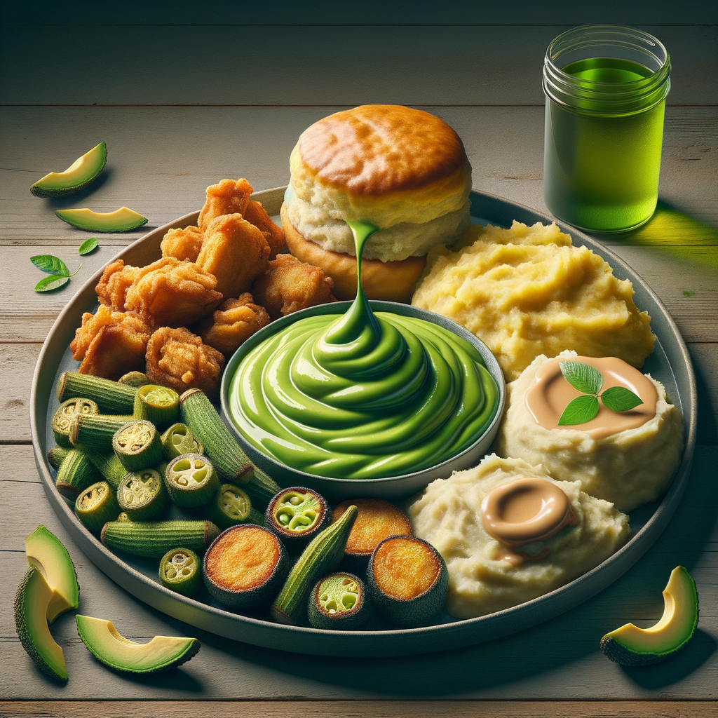 A comfort food trio of fried okra, mashed potatoes, and a warm biscuit, drizzled with a rich avocado dressing, marrying traditional Southern flavors with a creamy avocado twist.