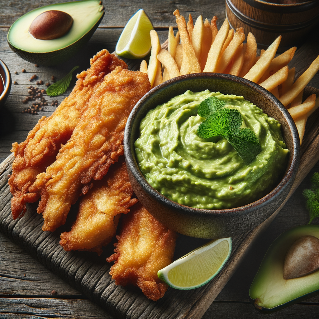 Crispy fried perch or catfish fillets served with a side of smooth avocado dip, combining the comfort of Southern cooking with the cool freshness of avocado.