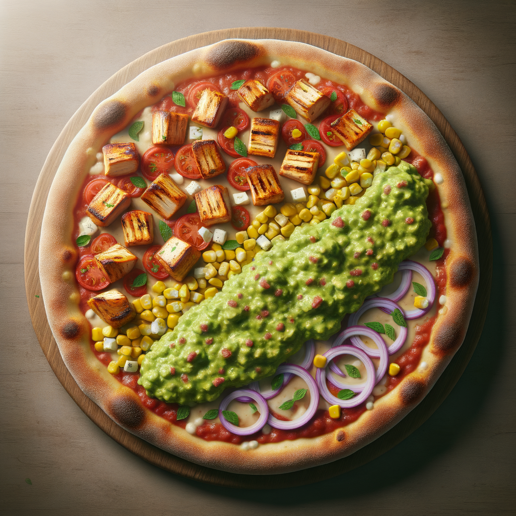 A fusion delight, this pizza features a thin crust topped with zesty marinara, mozzarella, grilled chicken, sweet corn, red onions, and a generous dollop of creamy guacamole spread on top after baking for a refreshing twist.