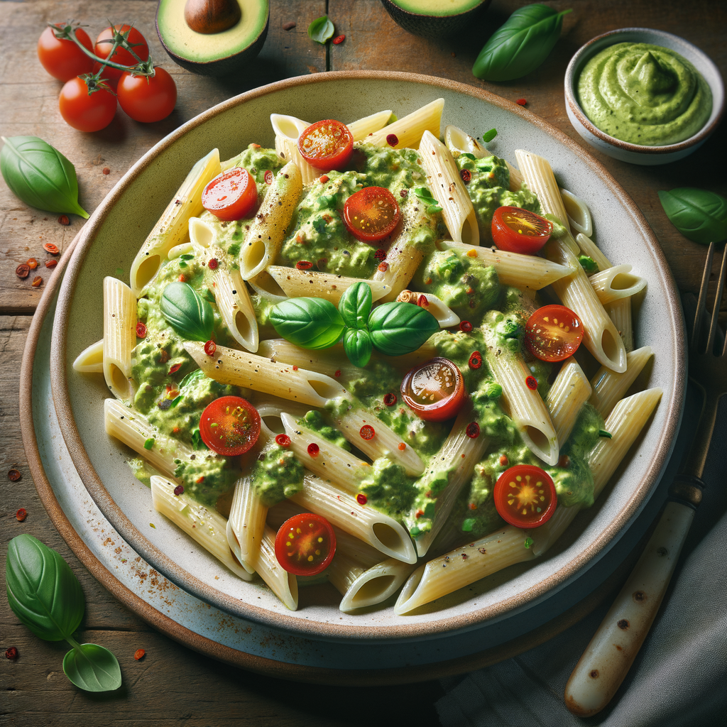 Al dente penne pasta tossed in a luxurious avocado cream sauce made from blended ripe avocados, garlic, and parmesan, garnished with fresh basil, cherry tomatoes, and a sprinkle of red chili flakes for a little kick.