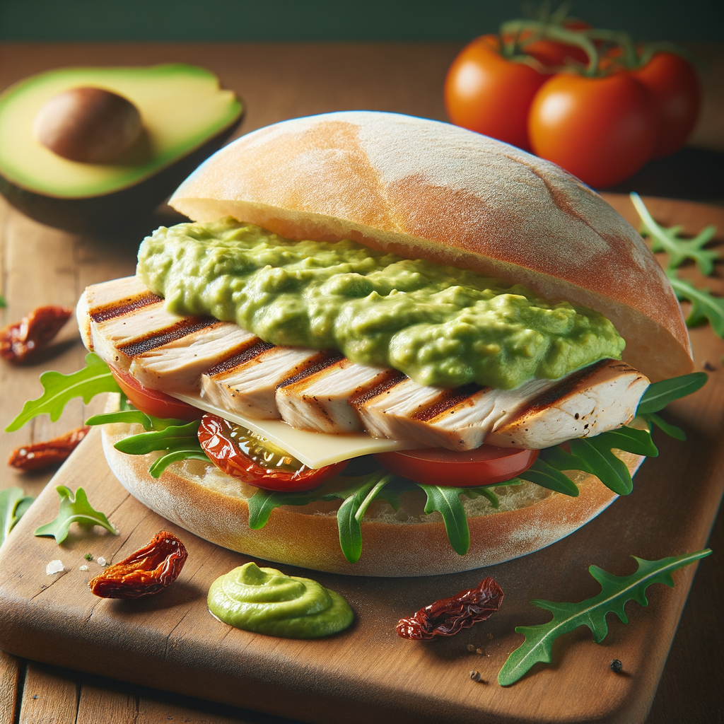 Grilled chicken breast drizzled with an avocado aioli, topped with a slice of Swiss cheese, sun-dried tomatoes, and arugula, served on a warm ciabatta roll. A divine combination that brings together the tenderness of chicken with the smooth richness of avocado.
