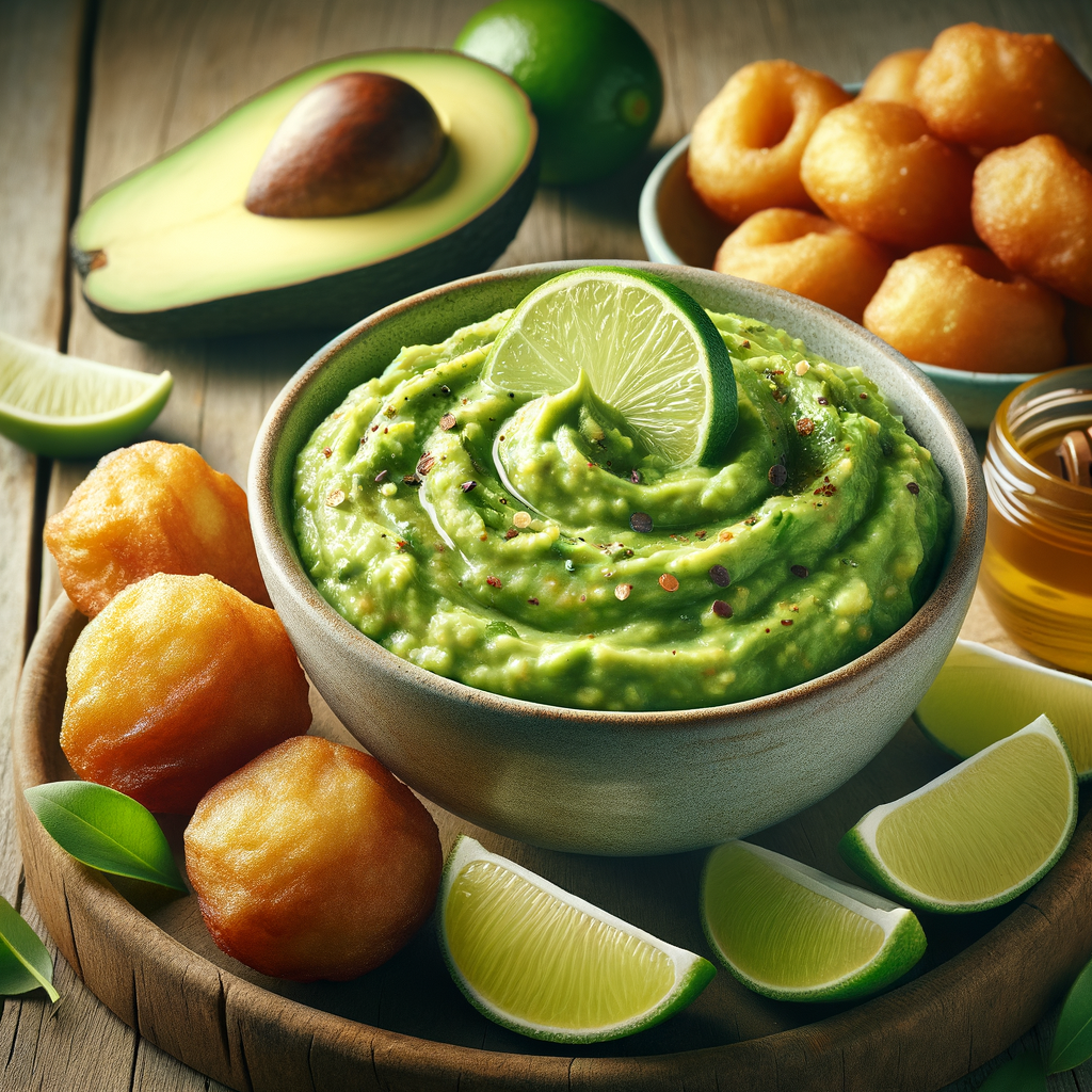 Fluffy beignets served with a side of sweet guacamole dip, made with ripe avocados, a hint of lime, and a touch of honey. Perfect for a sweet and savory brunch treat.