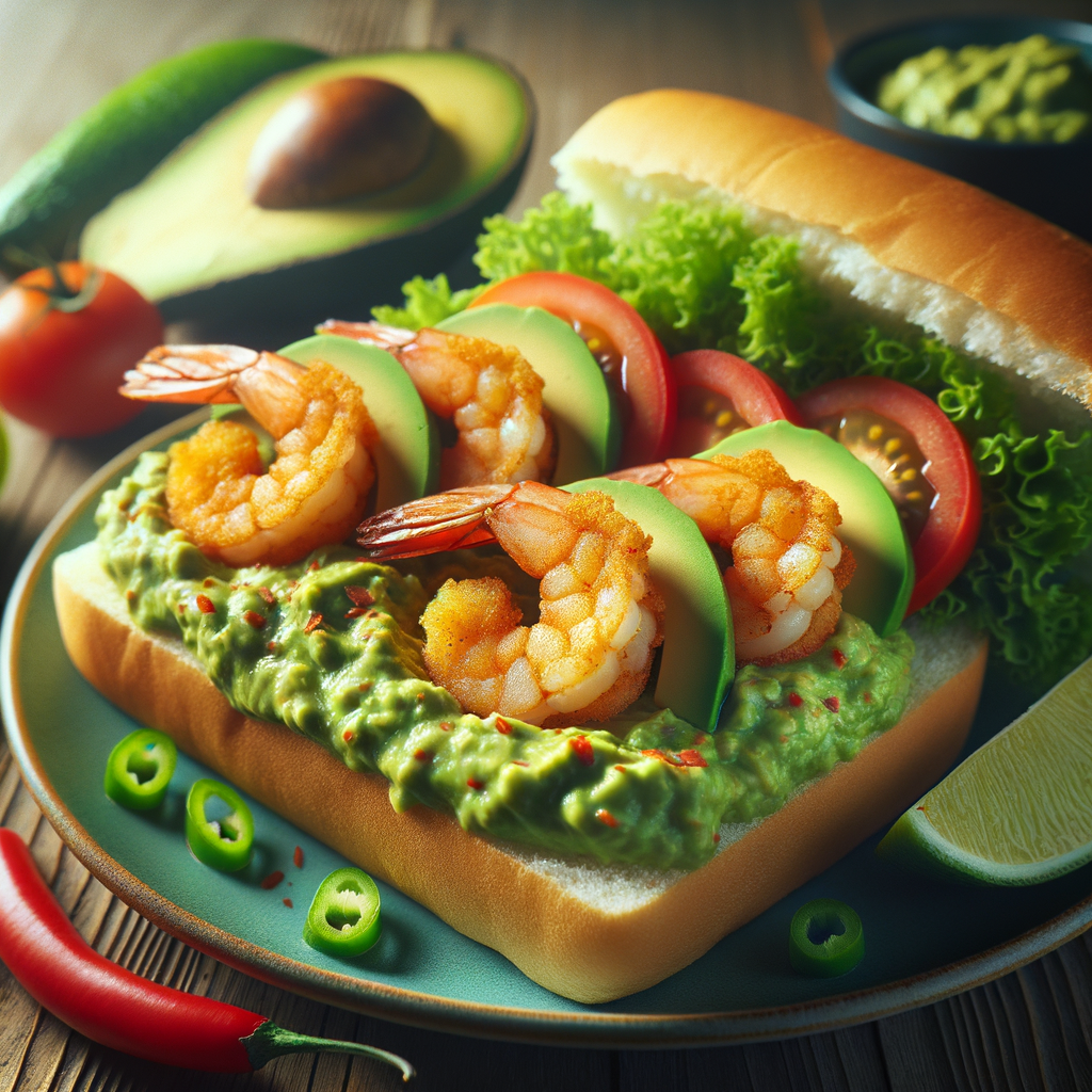 A classic po'boy sandwich filled with crispy fried shrimp, lettuce, tomatoes, and a generous spread of spicy avocado guacamole. A flavorful twist on a Southern favorite.