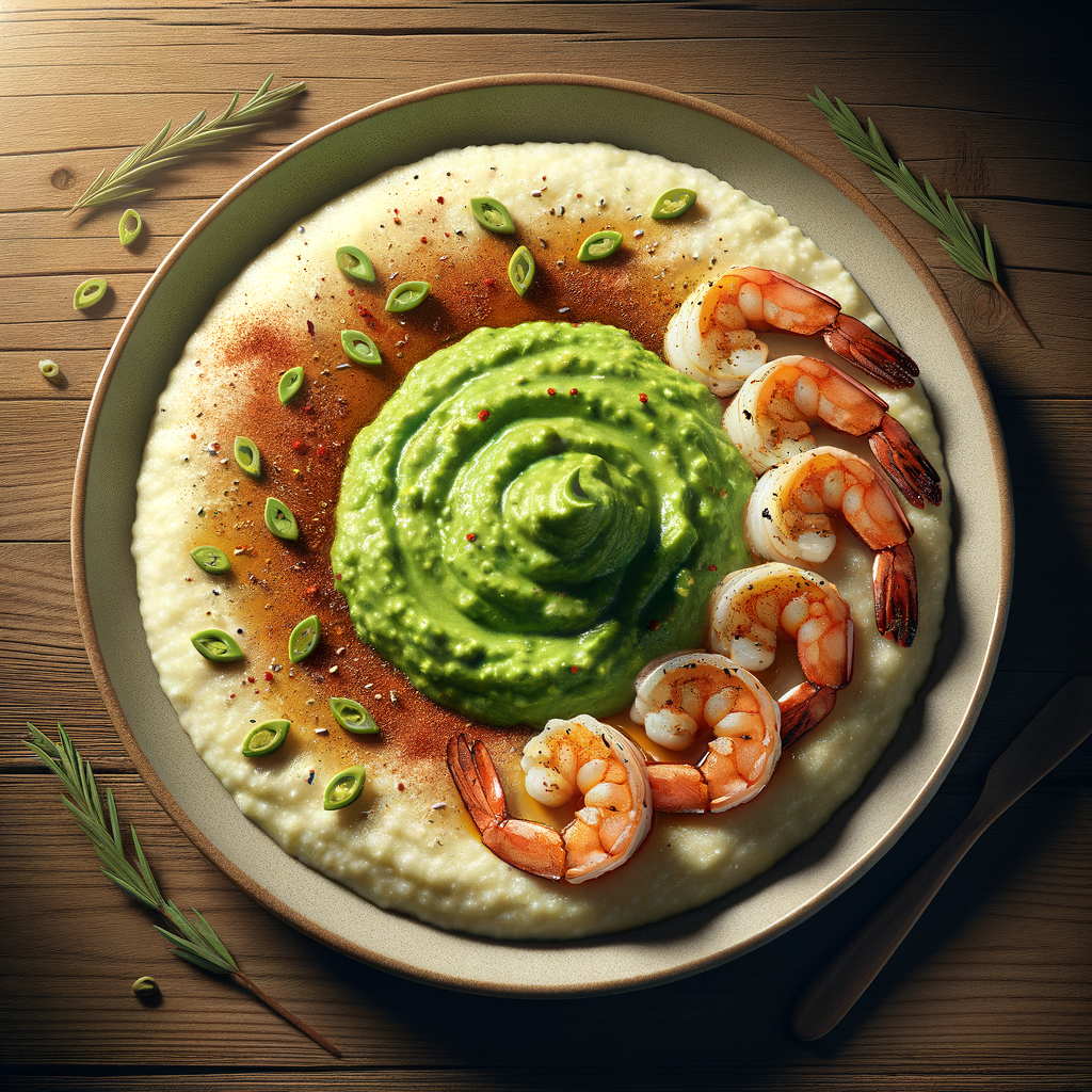 A hearty bowl of creamy Southern grits topped with a generous layer of avocado mash, grilled shrimp, and a sprinkle of Cajun spices.