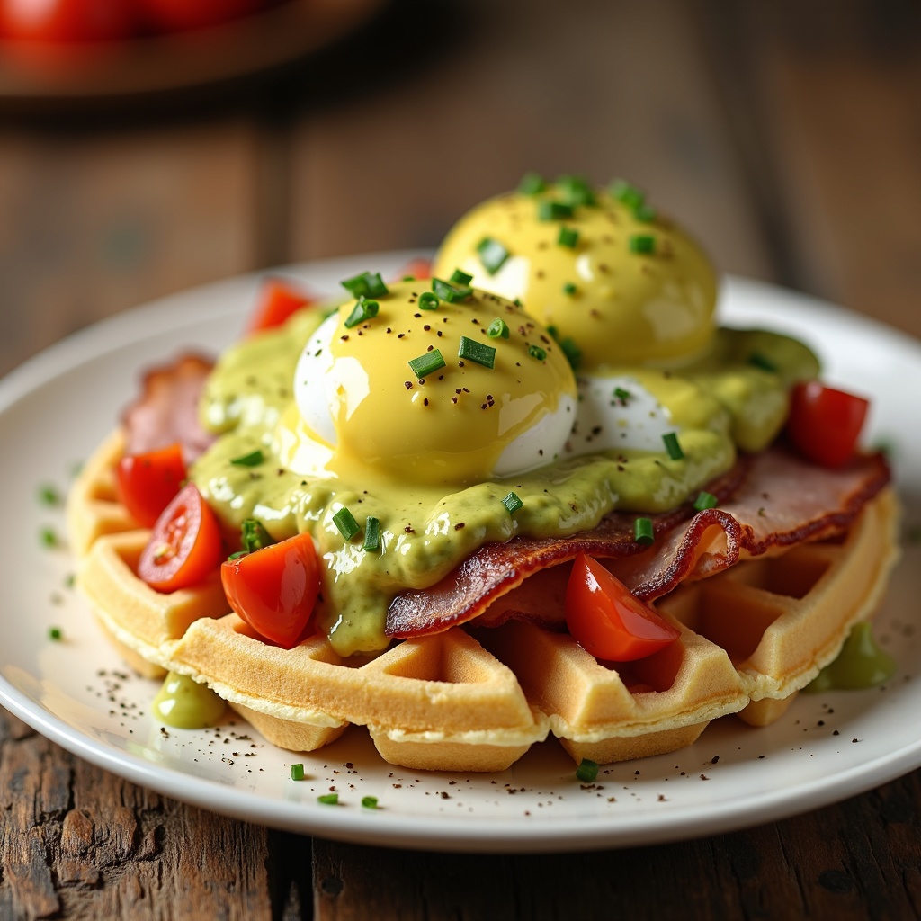 Crispy Belgian waffles topped with poached eggs, smoky ham, and a velvety hollandaise infused with guacamole. Garnished with diced tomatoes and a sprinkle of chives.