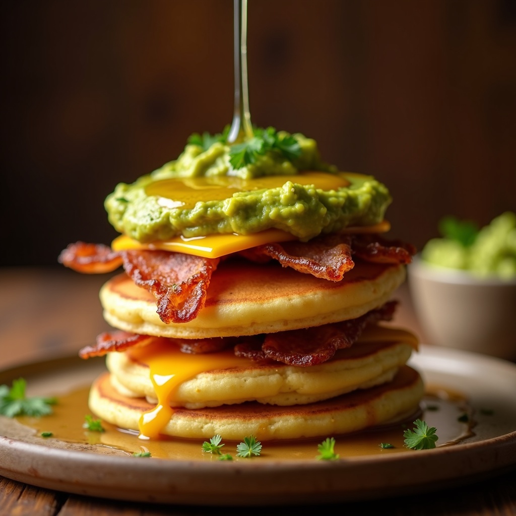 Fluffy buttermilk pancakes layered with creamy guacamole, crispy bacon, and melted cheddar. Topped with a drizzle of honey-lime syrup for a sweet-savory twist.