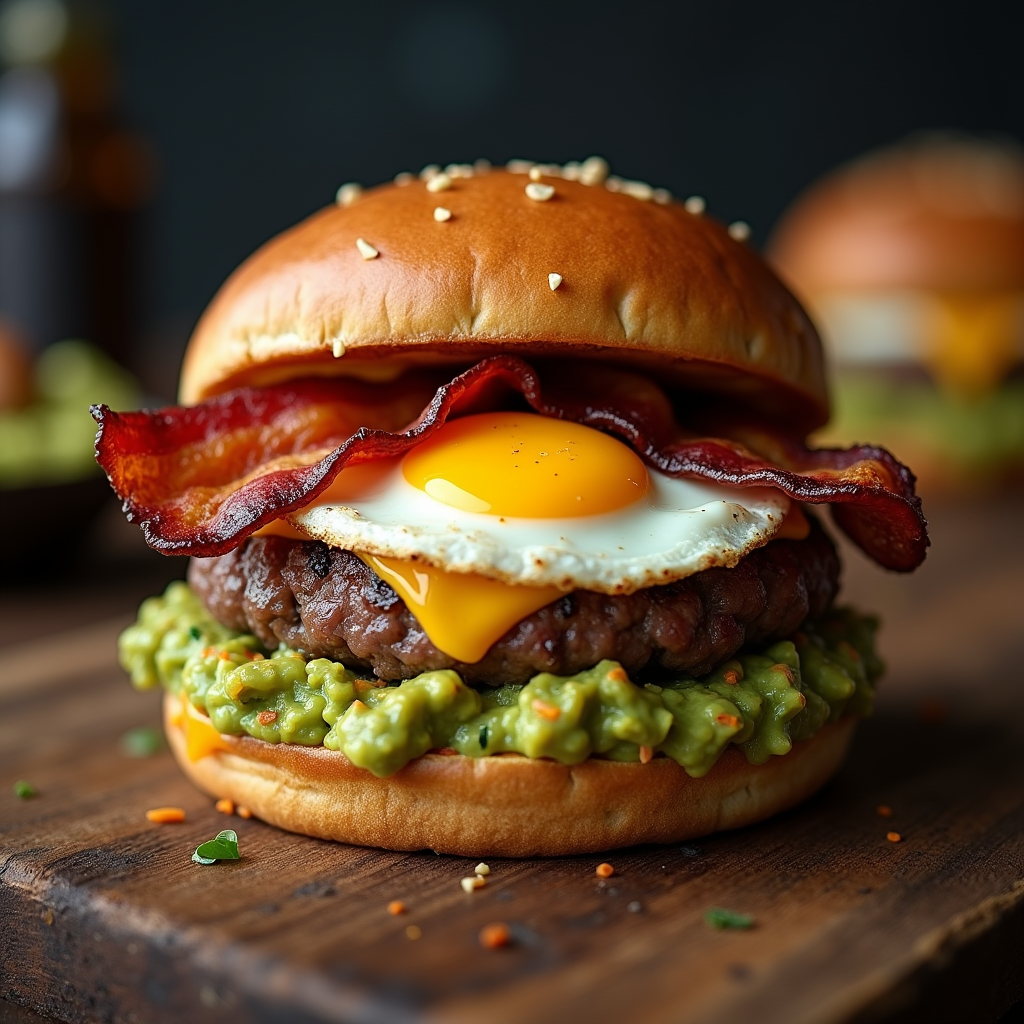 A juicy Wagyu patty topped with a fried egg, crispy bacon, chipotle guacamole, and melted cheddar between a toasted brioche bun. Creamy, smoky, and savory.