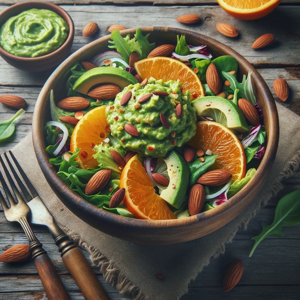 A refreshing salad that blends the creaminess of guacamole dressing with the sweetness of orange segments, complemented by mixed greens and toasted almonds. This dish is a celebration of Spanish flavors, with the guacamole dressing adding a smooth texture and a pop of color to the salad.
