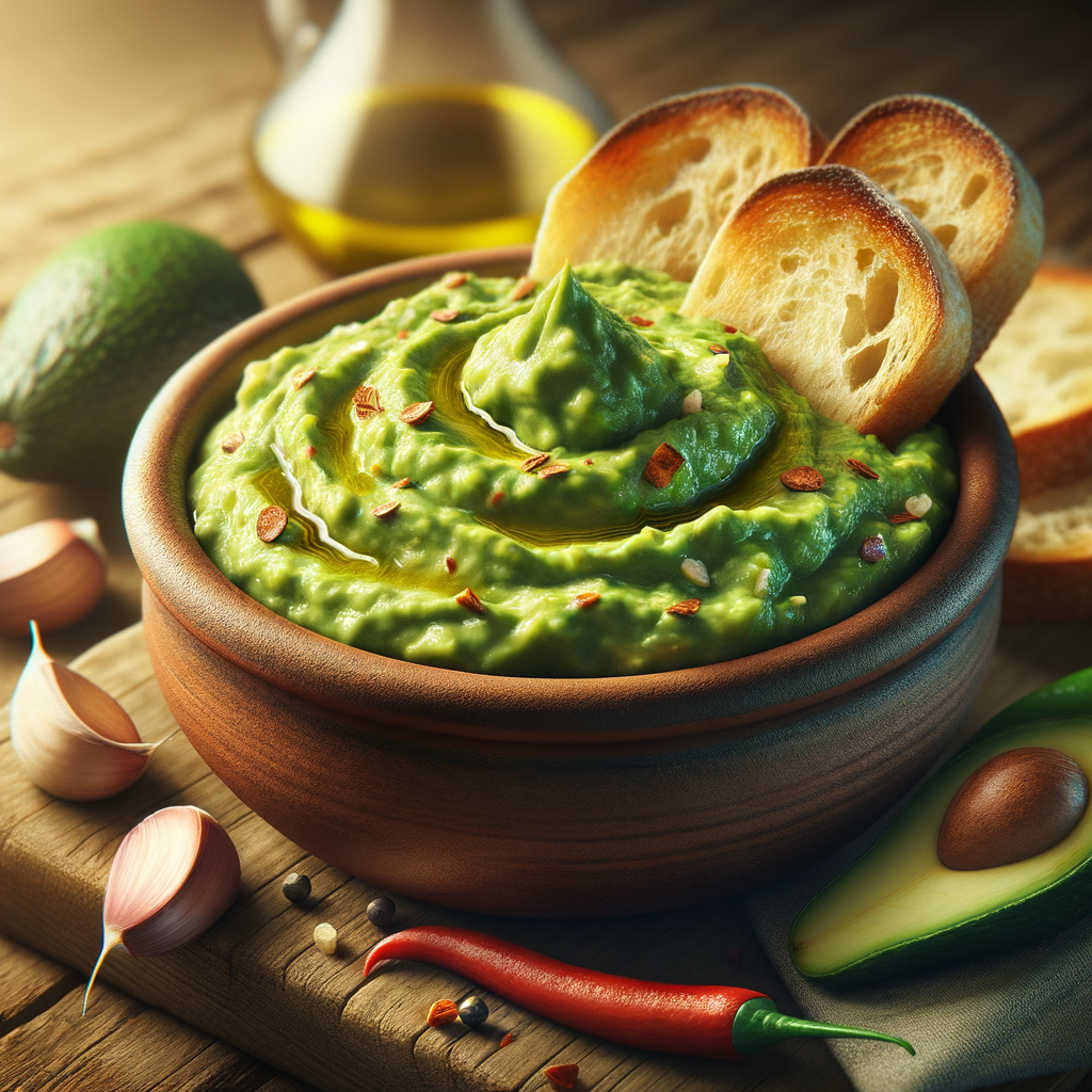 A twist on the traditional gambas al ajillo, this dish features a guacamole base infused with garlic, olive oil, and a hint of chili, served with a selection of toasted bread for dipping. The guacamole is prepared fresh, with a creamy, smooth texture, and is presented in a traditional Spanish clay dish to enhance the tapas experience.