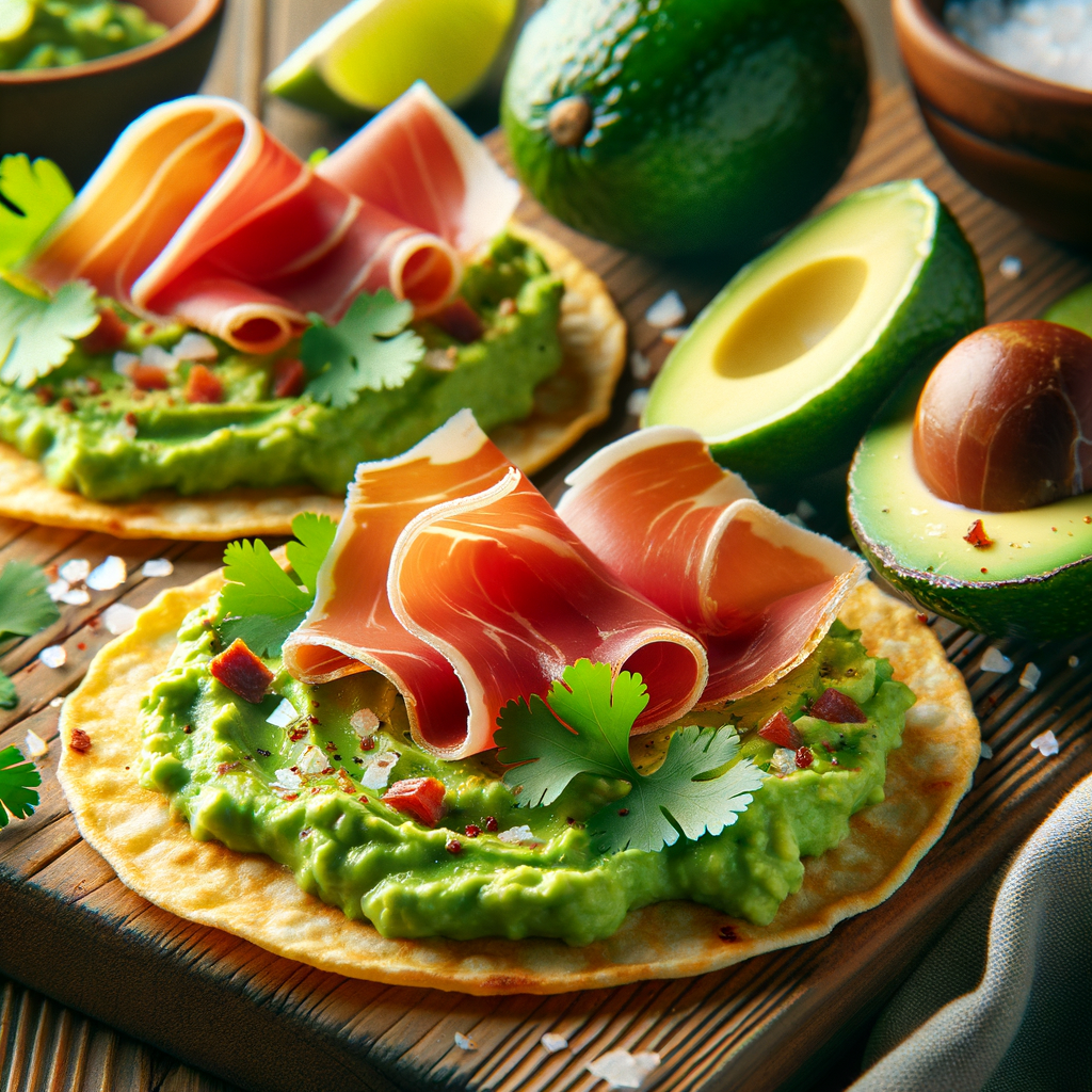 A modern Spanish tapa that combines the rich flavors of cured jamón ibérico with a layer of smooth avocado mash on top of crisp tostadas. The avocado is seasoned with lime juice, cilantro, and fleur de sel, creating a perfect balance of flavors and textures.