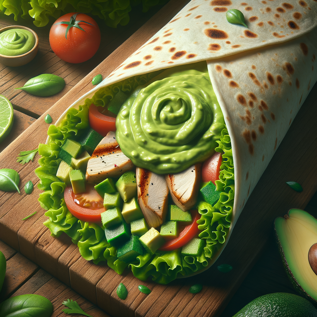 A healthy and refreshing option, this wrap includes a soft tortilla filled with grilled chicken, mixed greens, cherry tomatoes, and a drizzle of avocado dressing, all rolled up for a perfect bite every time.