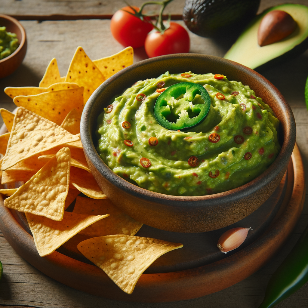A perfect appetizer or side, this dip combines mashed guacamole with diced jalapeños and a sprinkle of cheddar cheese, served with a side of crispy tortilla chips for dipping.