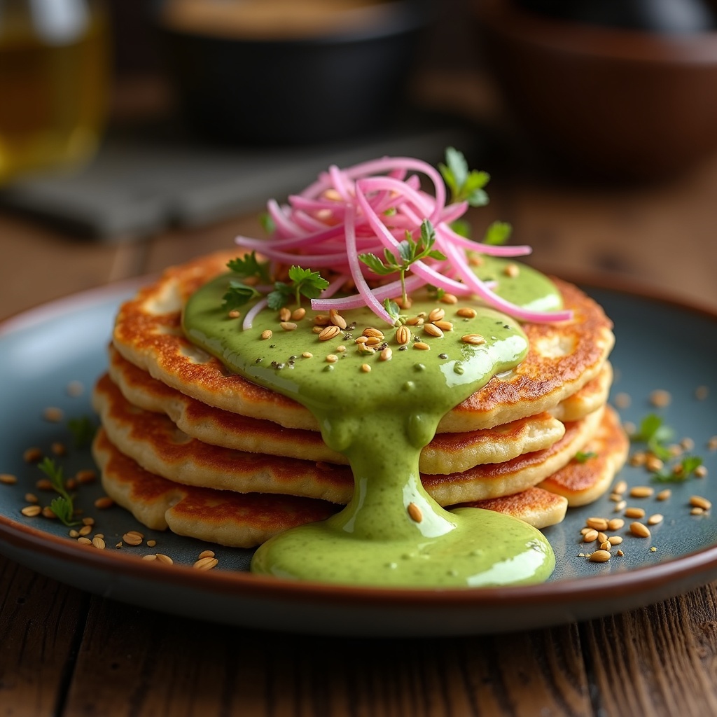 Flaky, crisp scallion pancakes drizzled with vibrant guacamole, topped with pickled red onions and sesame seeds. A fusion of Sichuan pepper warmth and creamy avocado richness.