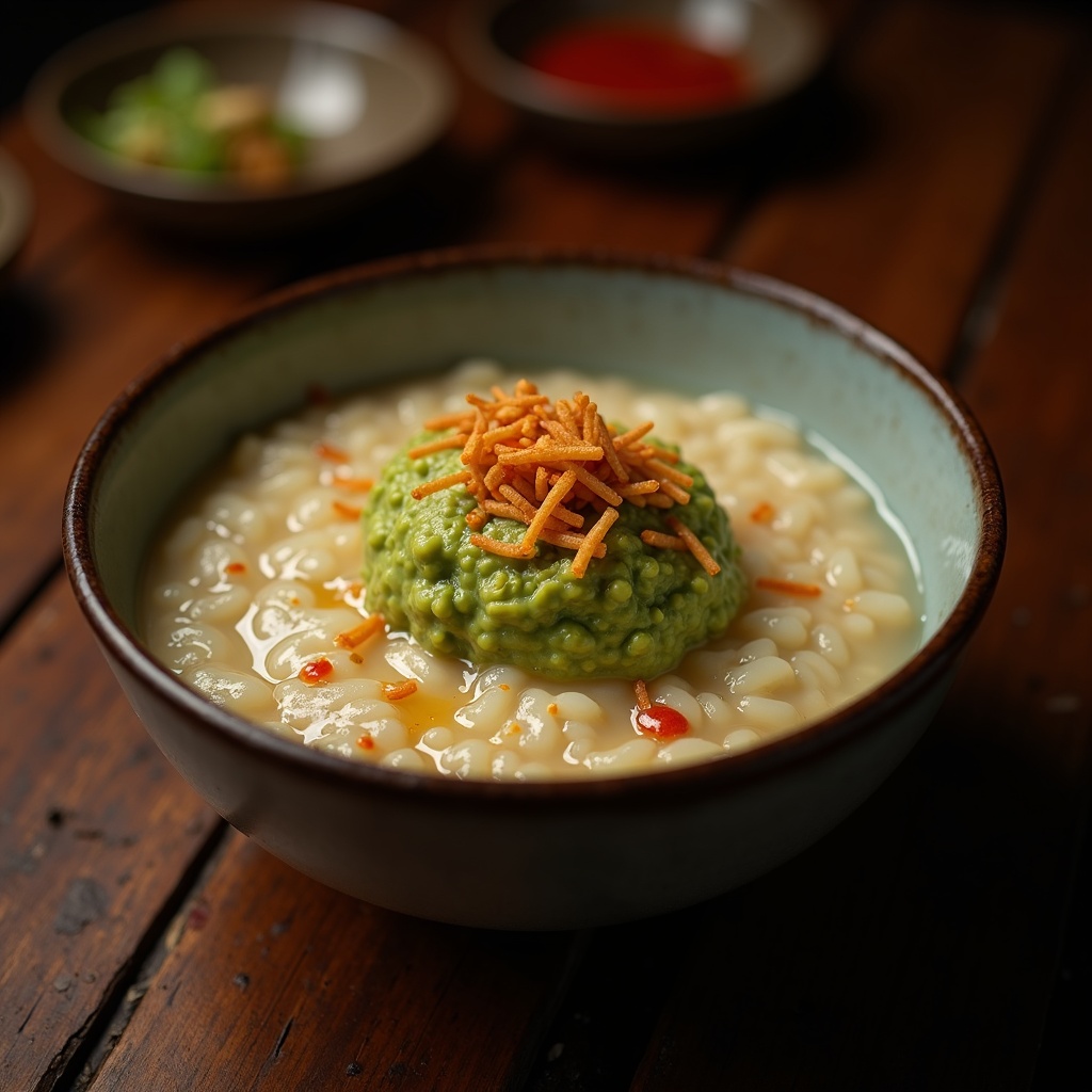 Creamy jasmine rice congee topped with silky guacamole, crispy shallots, and a drizzle of chili oil. A harmonious blend of comforting warmth and fresh, zesty avocado.