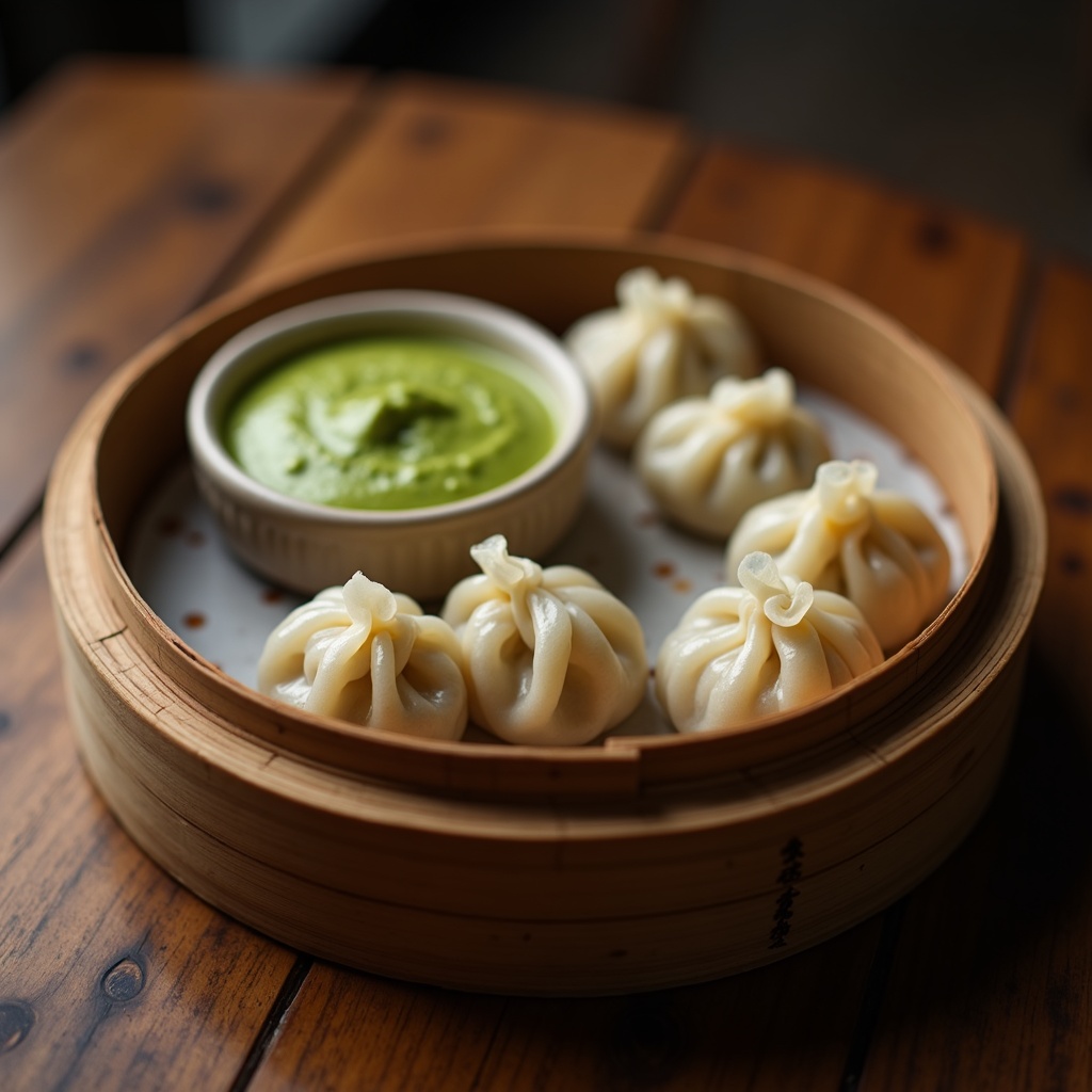 Silky dumpling wrappers enveloping a spicy Sichuan pork filling, served with a side of chilled avocado dip. The creamy dip balances the fiery heat with cool, buttery notes.