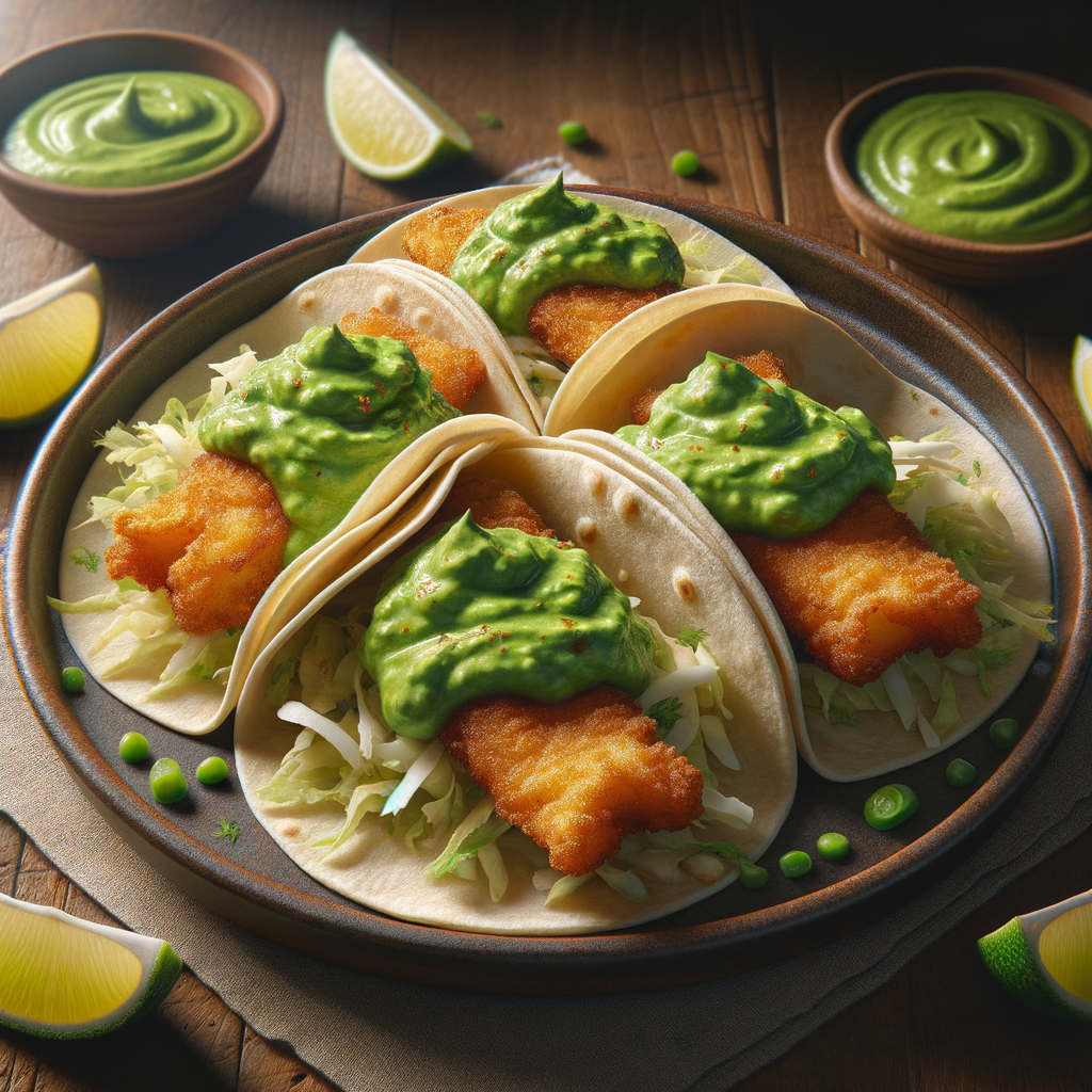 Soft tortillas filled with crispy beer-battered fish, shredded cabbage, and a spicy avocado crema drizzle, embodying the perfect blend of crunch and creaminess with a kick.