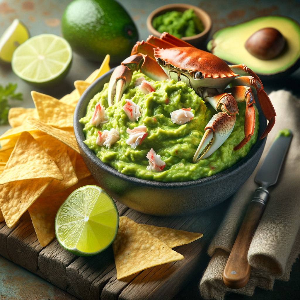 A harmonious blend of freshly mashed avocado and zesty lime juice, topped with succulent pieces of chilled crab meat, served with a side of crispy tortilla chips for dipping.