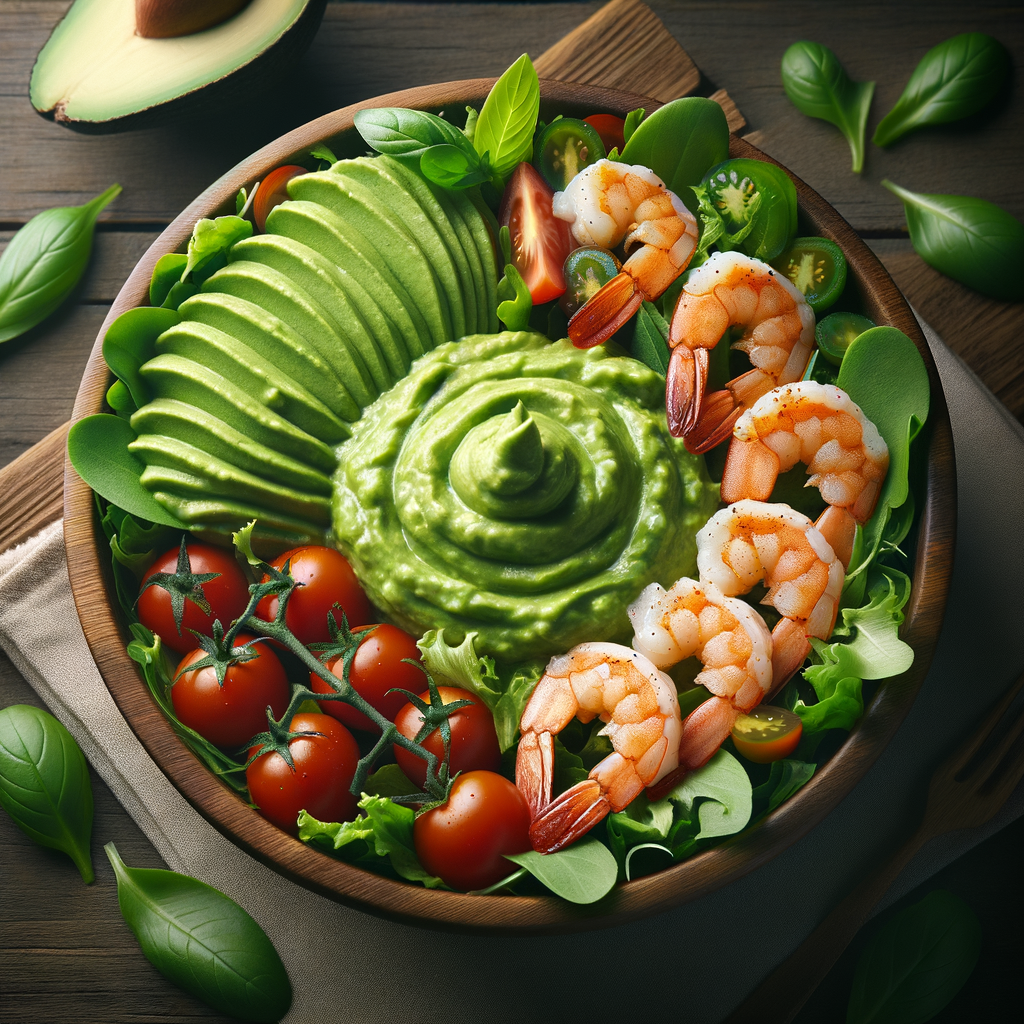A refreshing salad of crisp greens and cherry tomatoes, crowned with a generous dollop of creamy avocado dressing, topped with seasoned grilled shrimp for a delightful seafood twist.