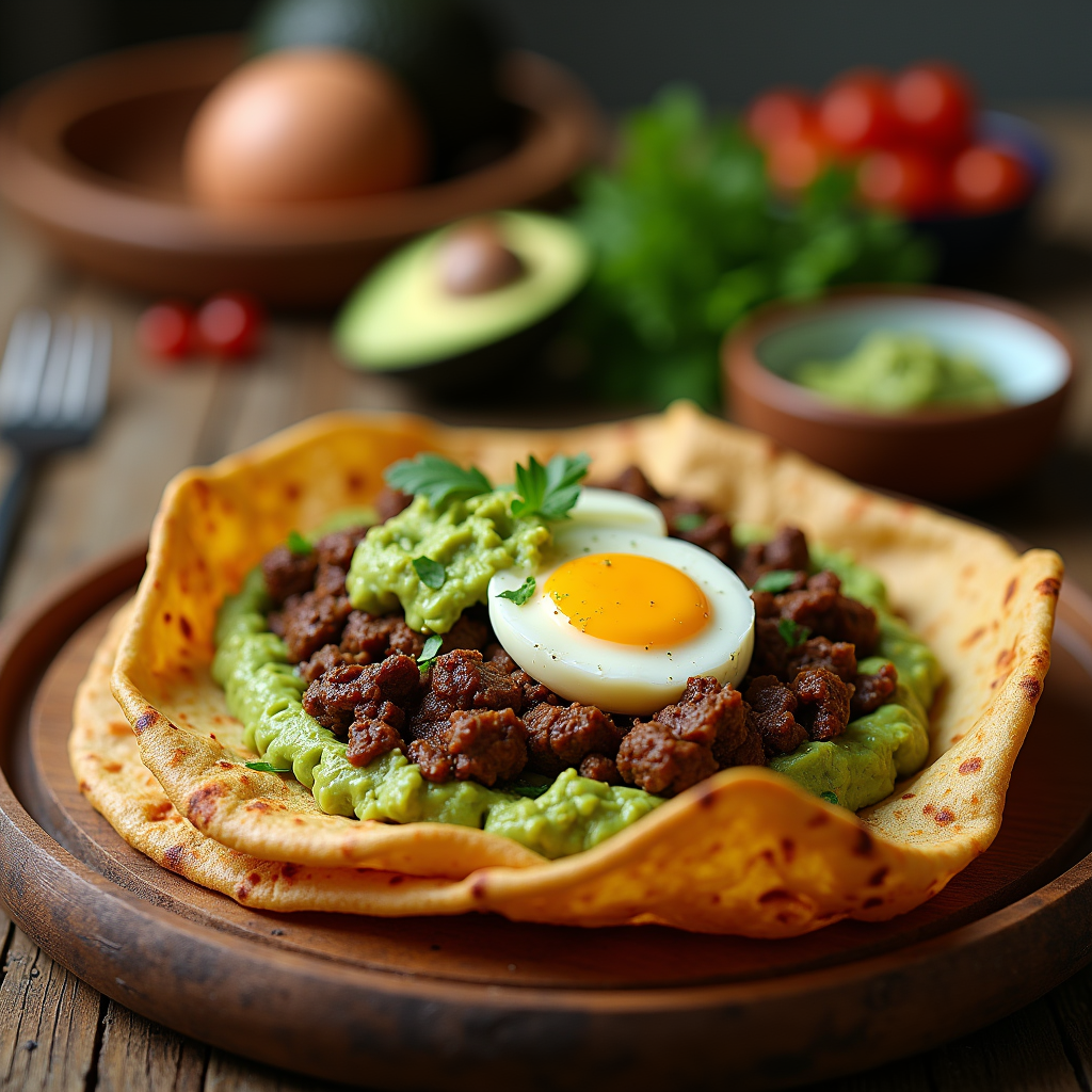 Savory beef suqaar with scrambled eggs nestled in creamy guacamole, served on a warm Somali injera. A vibrant, hearty start to the day with rich, spiced flavors.