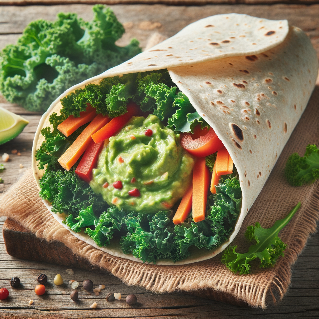 A wholesome wrap filled with creamy guacamole, fresh kale, shredded carrots, and bell peppers, all wrapped in a gluten-free tortilla. A refreshing and satisfying meal.