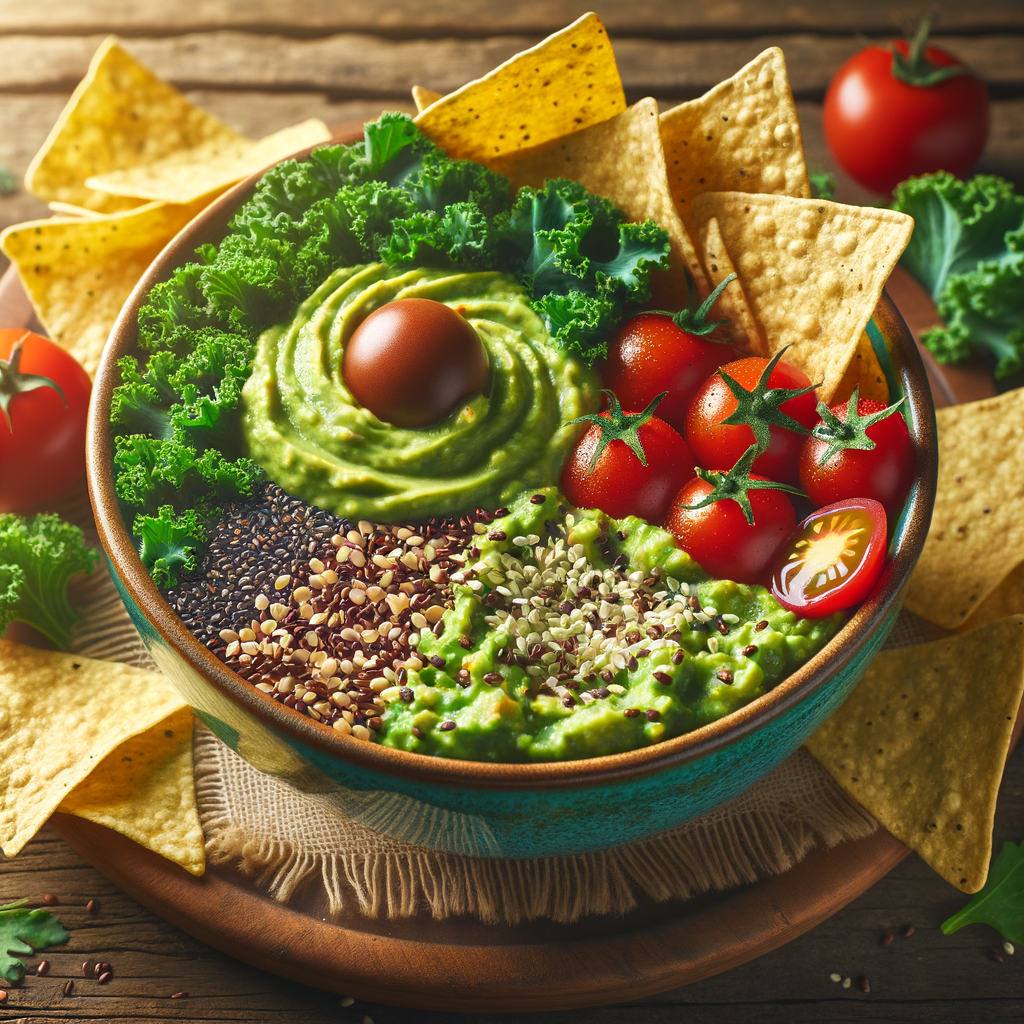 A vibrant bowl of creamy guacamole topped with quinoa, kale, cherry tomatoes, and a sprinkle of hemp seeds. Served with a side of gluten-free tortilla chips for a nutrient-packed snack.