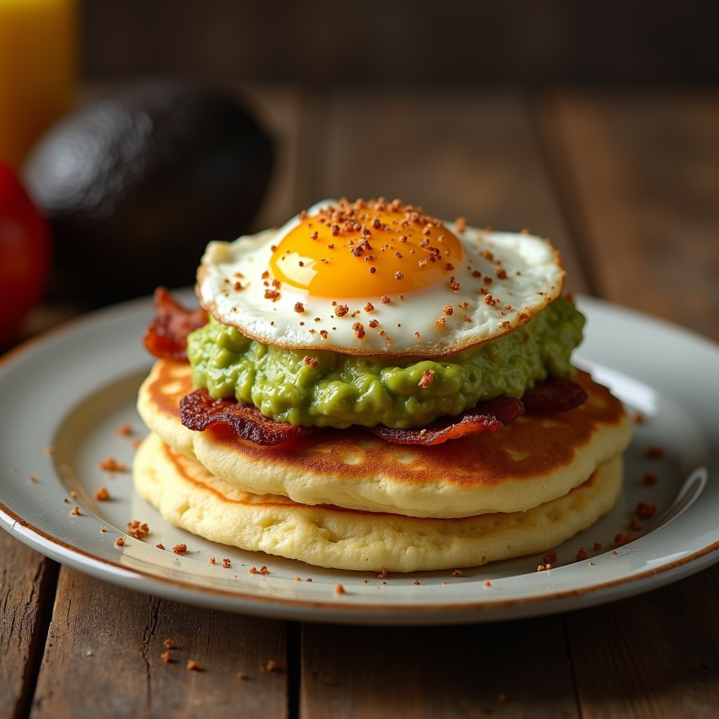 Fluffy pancakes layered with creamy guacamole, crispy bacon crumbles, and a sunny-side-up egg. A savory twist on a breakfast classic, offering a rich and satisfying start.