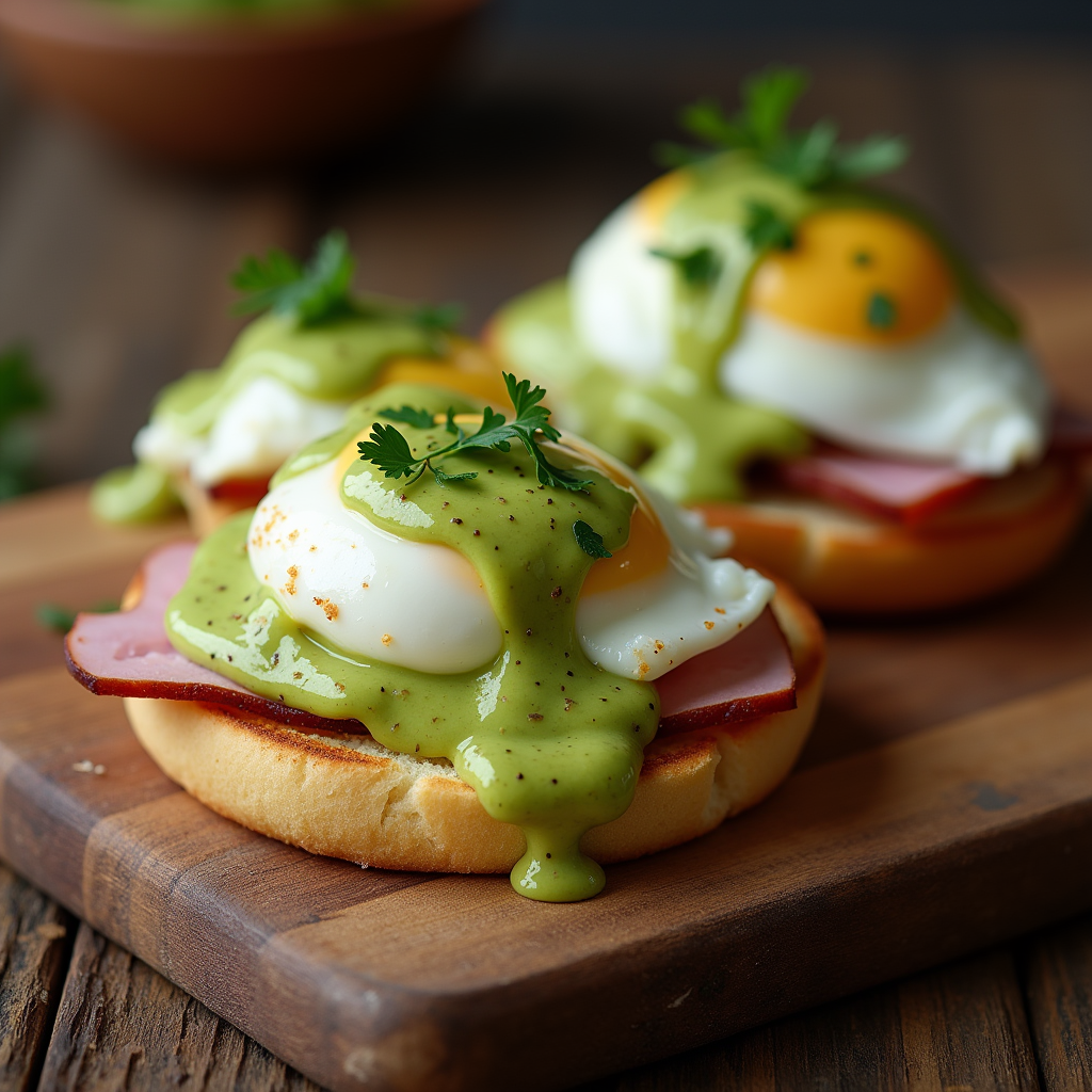Toasted English muffins topped with sliced ham, poached eggs, and a creamy guacamole hollandaise sauce. A tangy and rich take on a traditional Eggs Benedict.