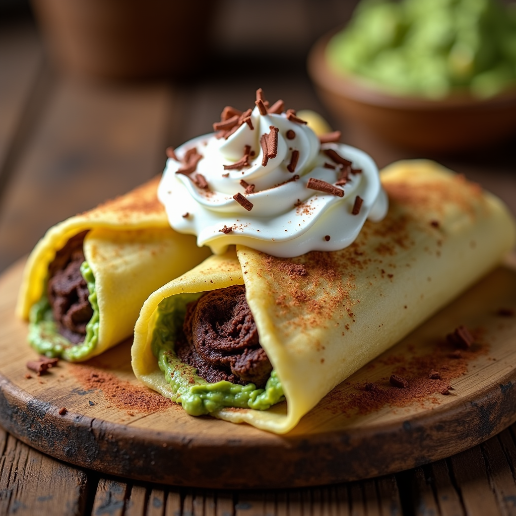 Delicate crepes filled with decadent chocolate mousse and a hint of sweet guacamole. Topped with whipped cream and chocolate shavings, a surprisingly delightful dessert fusion.