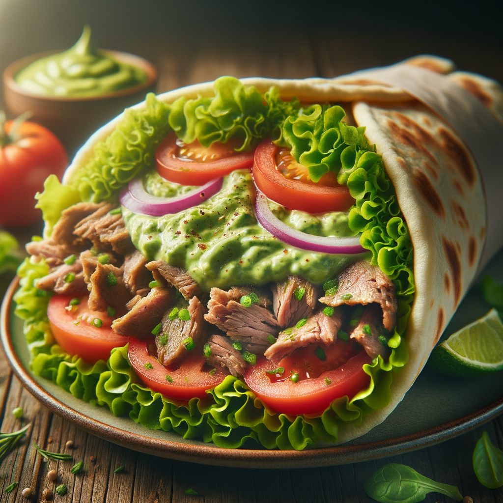 A Greek-inspired gyro wrap filled with tender slices of lamb, fresh lettuce, tomatoes, onions, and a generous spread of avocado tzatziki sauce, all wrapped in a warm pita bread.