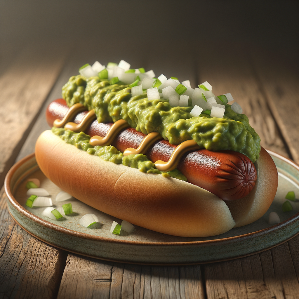 A twist on the classic Coney Island hot dog, this dish features a juicy grilled hot dog nestled in a soft bun, topped with a generous dollop of zesty guacamole, diced onions, and a drizzle of mustard.