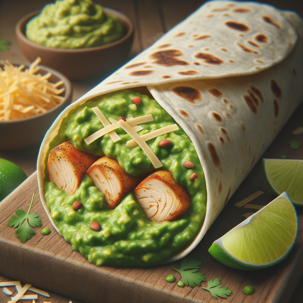 A spicy chicken tender wrapped in a soft tortilla with creamy guacamole, shredded cheese, and a hint of lime for a zesty kick.
