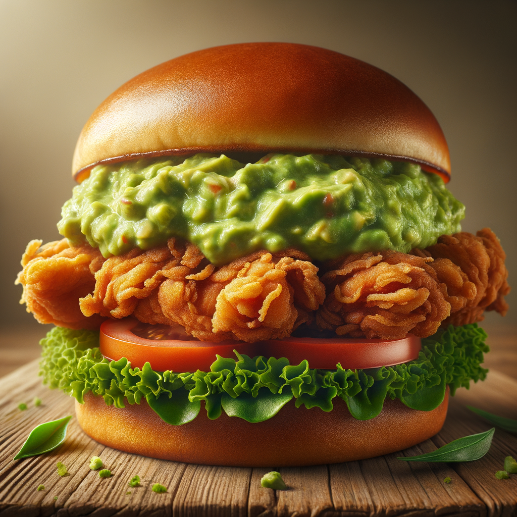 A crispy fried chicken fillet topped with a generous layer of creamy guacamole, fresh lettuce, and ripe tomato slices, all nestled in a toasted bun.