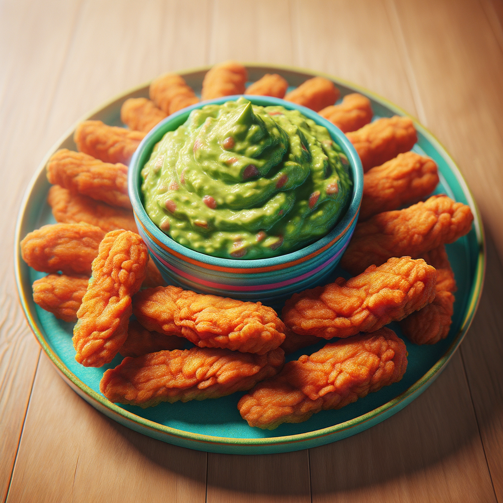 Crispy chicken tenders served with a side of smooth, creamy guacamole for dipping, offering a refreshing twist to a classic favorite.