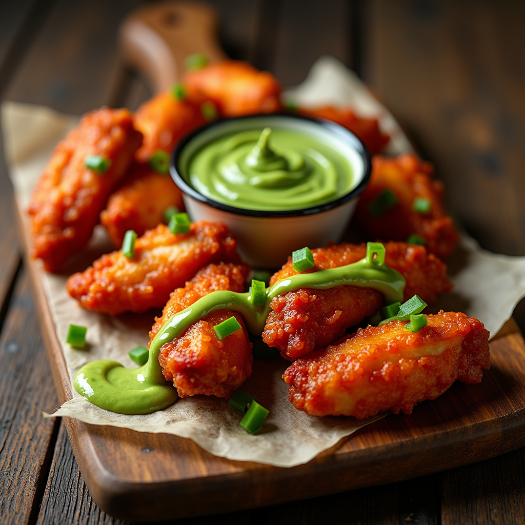 Crispy hot wings drizzled with a cooling, creamy avocado dressing. Tangy, spicy, and refreshing – a perfect appetizer to share. Vibrant green guacamole contrasts the fiery wings.