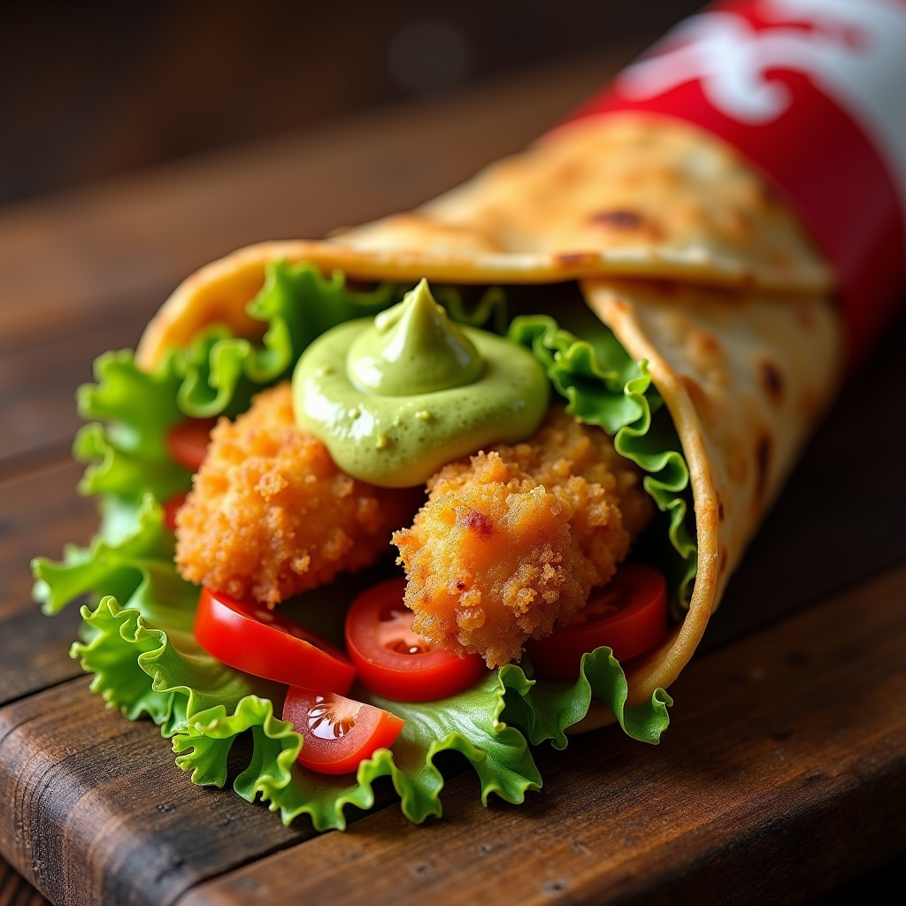 A Twister wrap featuring KFC's signature chicken tenders, crisp lettuce, diced tomatoes, and a generous swirl of vibrant green guacamole. A fresh and portable appetizer.
