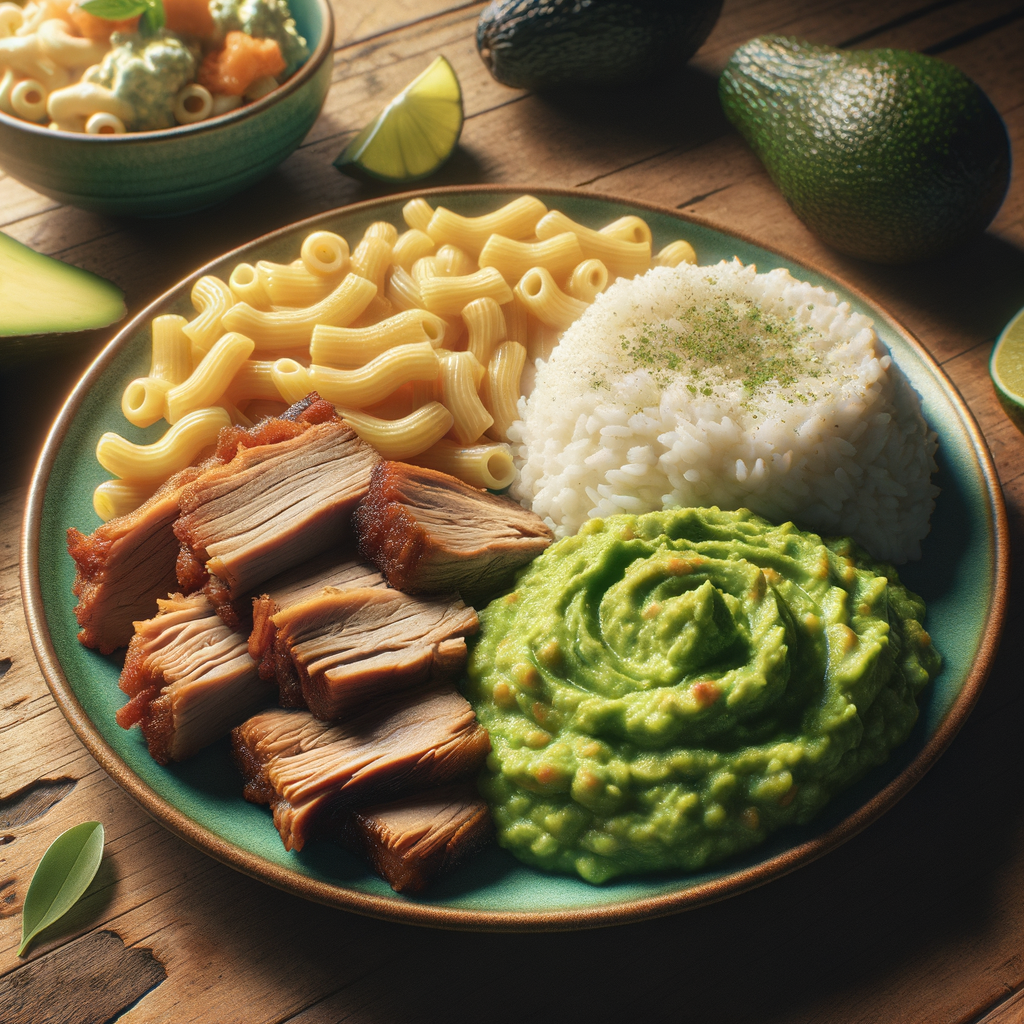 Tender Kalua Pork served with a side of creamy guacamole, steamed rice, and macaroni salad. The guacamole adds a fresh, vibrant flavor to the smoky pork.