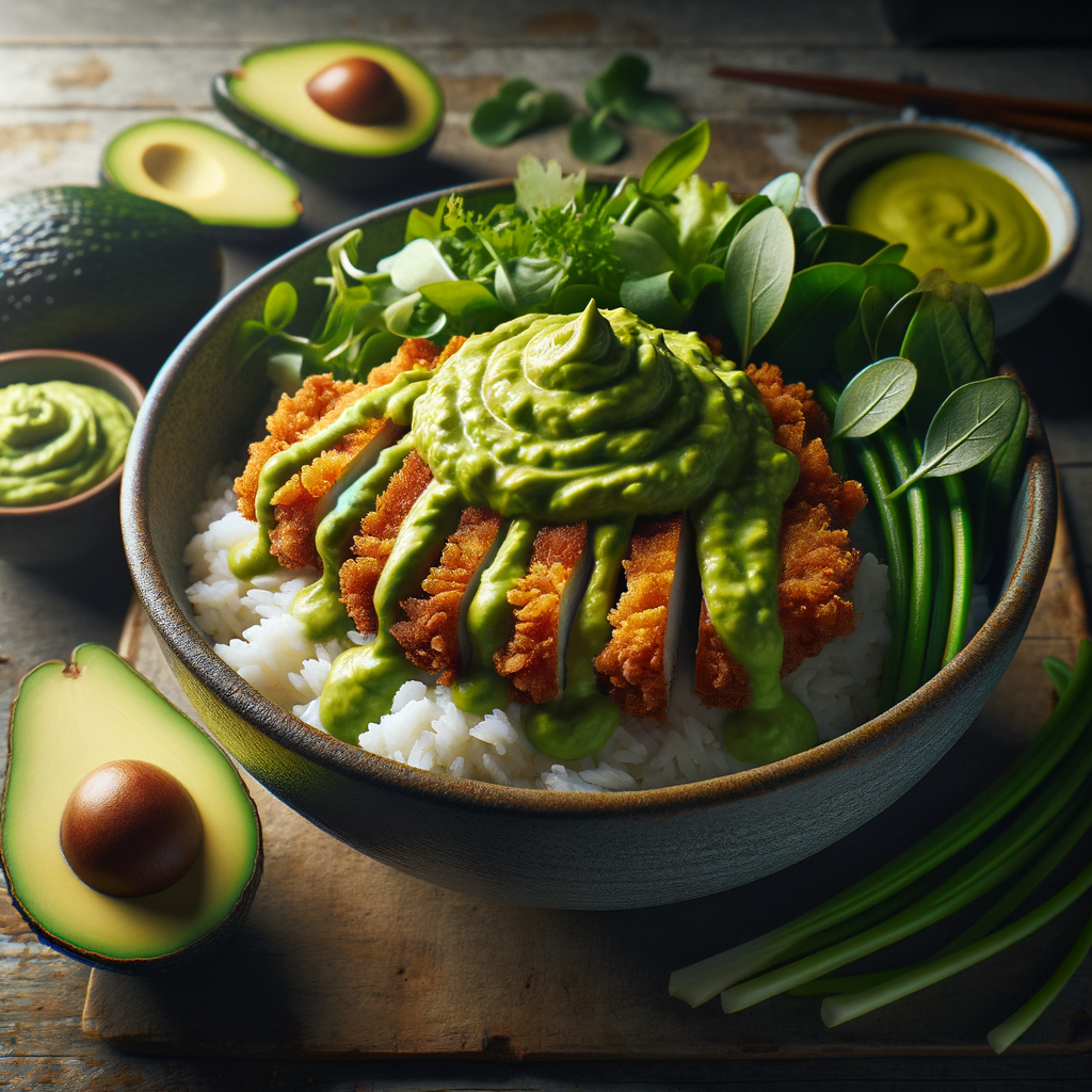 Crispy Chicken Katsu topped with a smooth avocado dressing, served over rice with a side of fresh greens. The avocado dressing adds a rich, creamy texture to the crispy katsu.