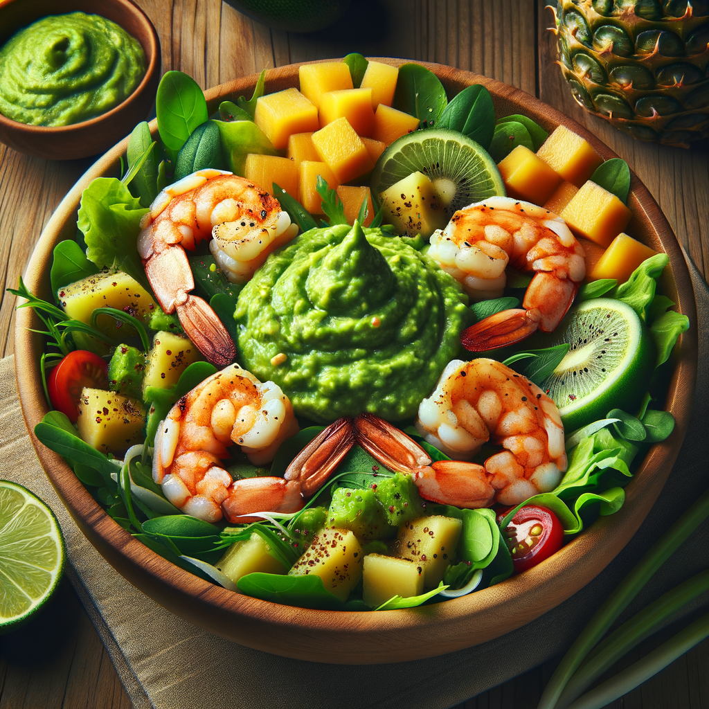 Grilled shrimp served on a bed of mixed greens, topped with a luscious avocado dressing and tropical fruits. The avocado dressing enhances the freshness of the shrimp and fruits.