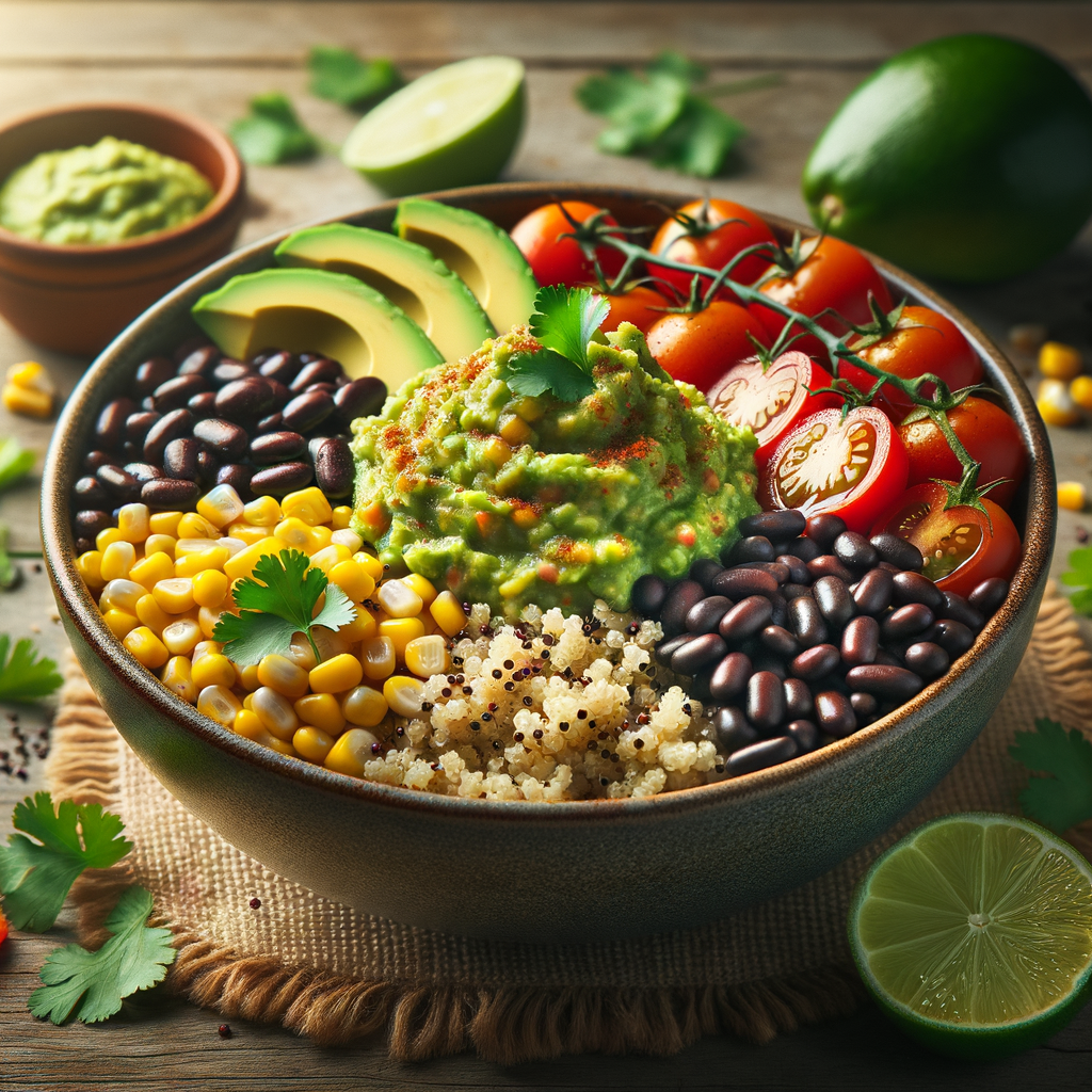 A hearty bowl filled with fluffy quinoa, black beans, sweet corn, cherry tomatoes, and a generous dollop of zesty guacamole. Topped with freshly chopped cilantro and a squeeze of lime for an extra kick of flavor.