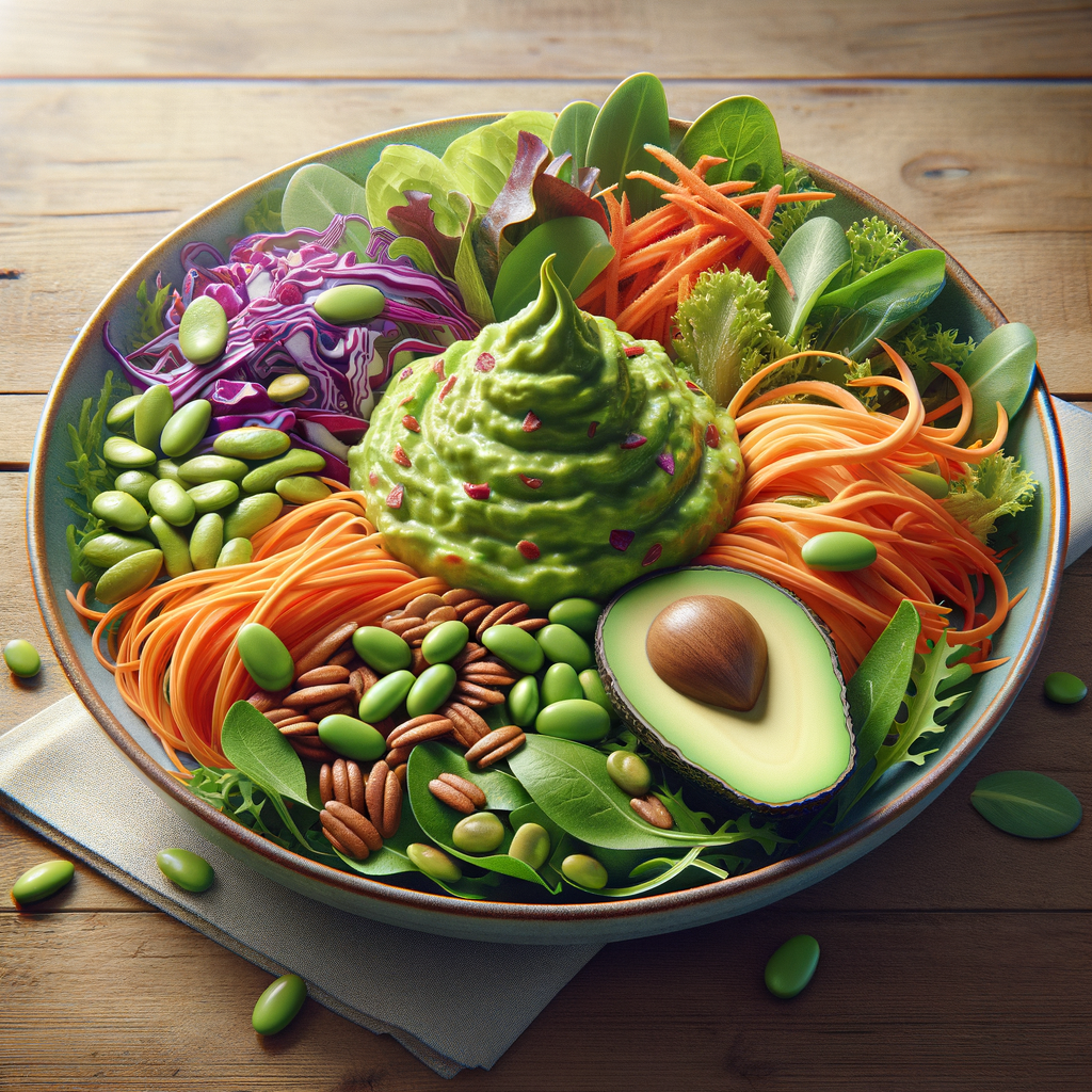 A refreshing salad with mixed greens, spiralized carrots, red cabbage, edamame, and crunchy pepitas, all tossed with a light avocado dressing. The salad is finished with a hearty scoop of guacamole for a creamy and satisfying touch.