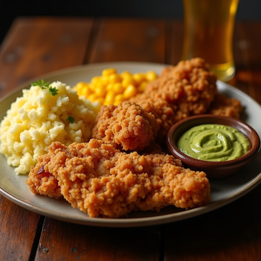 Crispy Southern fried chicken served with creamy mashed potatoes, buttery corn, and a side of cool, zesty guacamole dip. A perfect balance of crunchy, creamy, and fresh flavors in every bite.